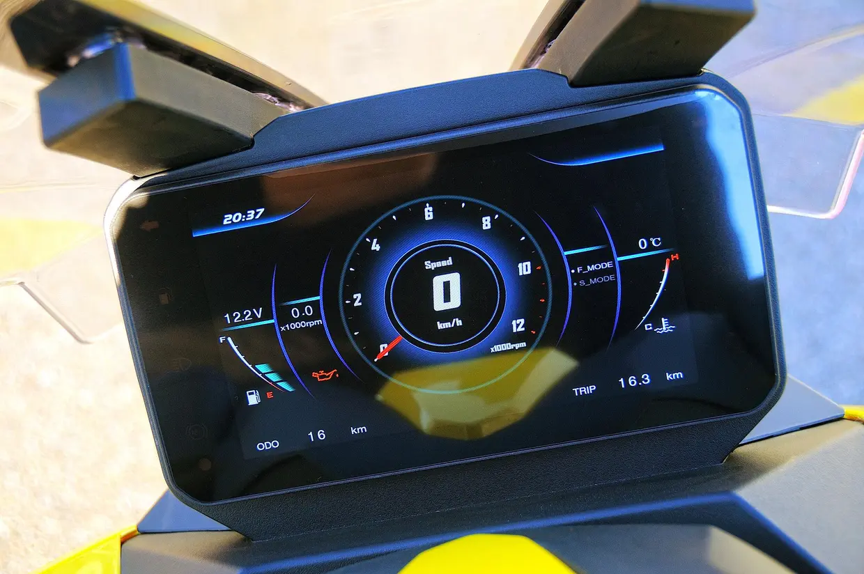 Il display dello Storm-V è uno schermo TFT da 7” dotato di tutte le indicazioni. Sulla versione Plus ha una doppia visualizzazione e ospita il navigatore connesso al cellulare. Il vano sottosella è capiente e profondo, può accogliere un casco integrale e rimane ancora spazio per altri oggetti