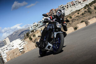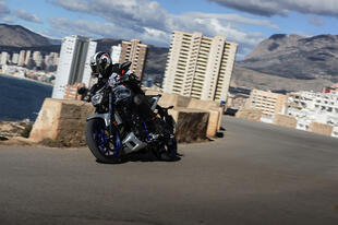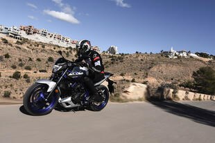 La posizione di guida è comoda, col busto eretto e le braccia distese verso il largo manubrio: si ha subito la sensazione di avere tutto sotto controllo. Lo spazio a disposizione è abbondante, anche i piloti alti, intorno al metro e ottanta, si trovano bene. In movimento la MT risulta facile e leggera, si guida senza impegno e la sella bassa (78 cm) permette di mettere i piedi a terra con sicurezza. Il motore riprende senza esitare dai 2.000 giri, ma la spinta comincia a essere vigorosa solo tra i 5 e i 6.000 e il meglio arriva ancora più avanti, da 8.000 giri in su fino a 13.000 giri. Sui percorsi con molte curve la MT-03 è molto divertente: stabile e precisa, imposta rapida le curve e anche la frenata è efficace, a patto di azionare con decisione il comando.