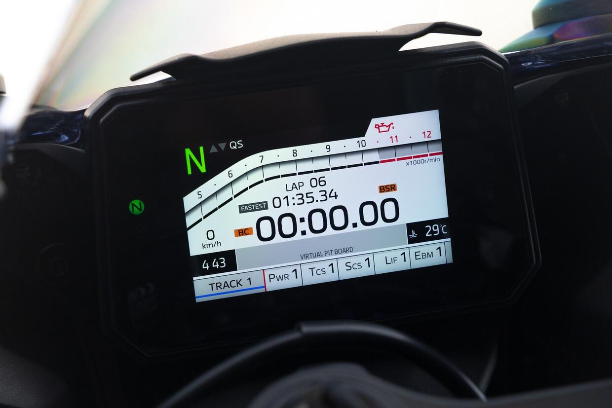 Il pilota ha a disposizione 4 riding mode, 3 livelli di risposta dell'acceleratore, 3 (+ spento) del controllo di trazione Cornering, 3 step di regolazione dello slide control, 3 anche per l'antimpennata e 2 per la gestione del freno motore. Ma non è finita qui: l'ABS è disinseribile al posteriore, c'è il Launch Control e il cambio elettronico bidirezionale di serie ha 2 modalità di intervento. Il tutto si gestisce con grande facilità tramite il joystic presente sul blocchetto di sinistra ed il nuovo cruscutto TFT da 5" che, grazie alla connettività, è dotato di particolarità funzionalità per chi gira in pista tra cui la possibilità di mandare messaggi strategici per far comunicare box e pilota.