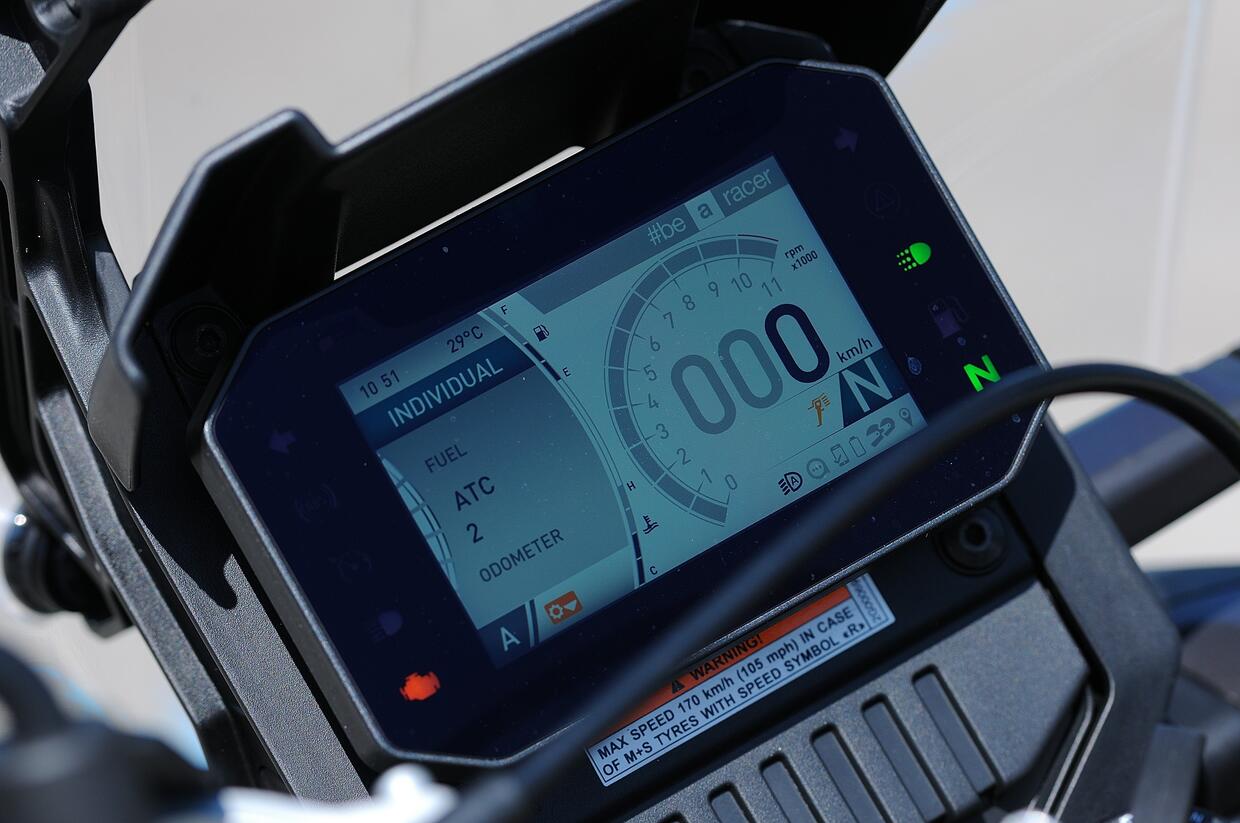 La strumentazione si affida ad un bel display TFT a colori di 5" dal quale si gestiscono i quattro riding mode regolando la mappa di erogazione e il livello di intervento del freno motore, del controllo di trazione e dell'ABS con modalità off-road.
