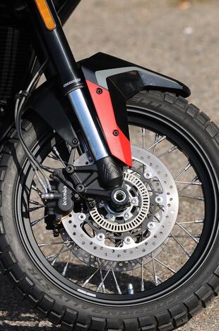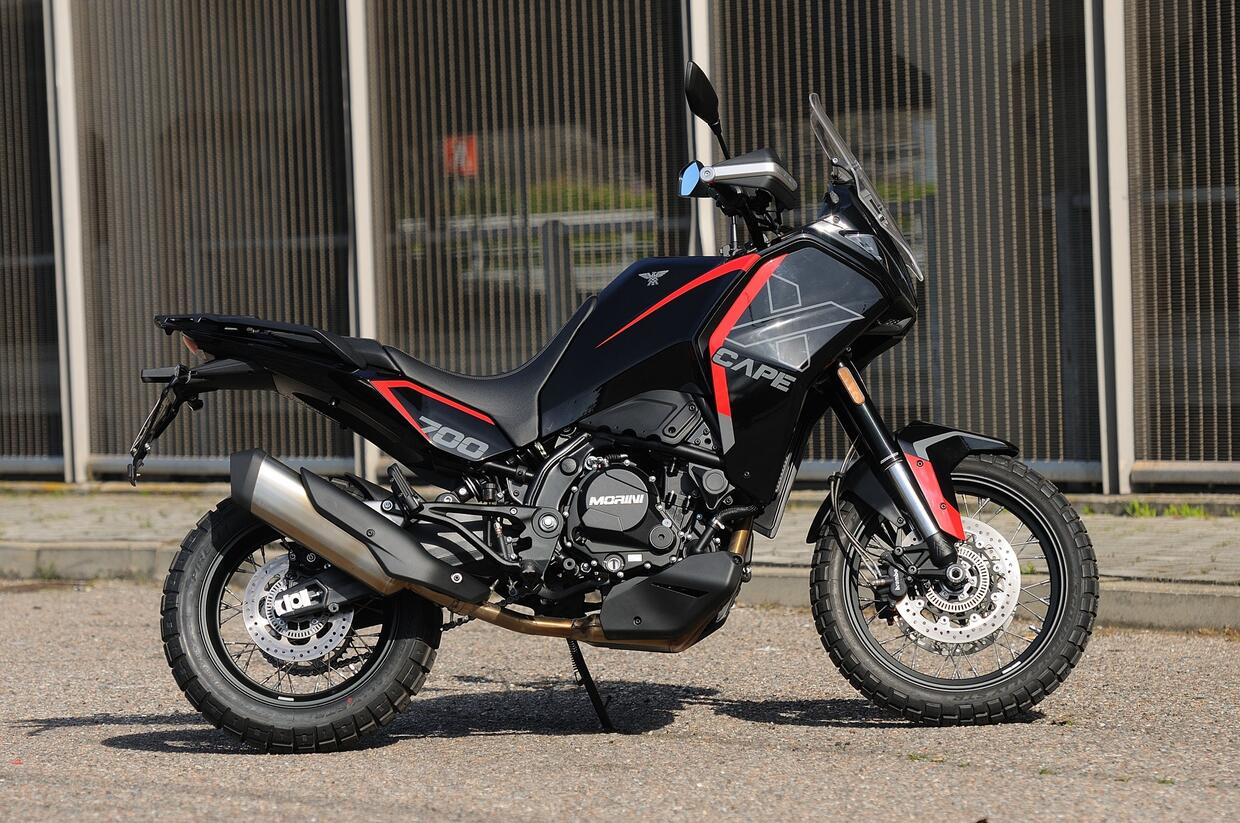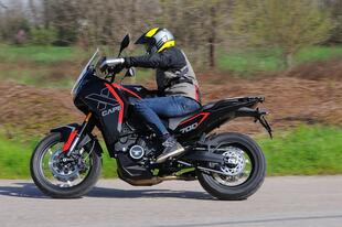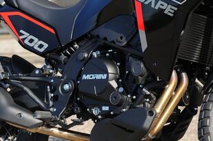 La Moto Morini X-Cape 700 è una vera evoluzione rispetto alla precedente 649. Prodotta in Cina ma italiana nell'anima, è una moto versatile, potente il giusto ed equipaggiata con ruote da 19" e 17", gommata Pirelli Scorpion STR, uno pneumatico ottimo per la strada e che può supportare la guida anche su strade bianche.