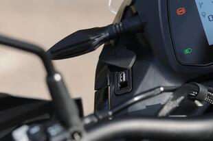 Il parabrezza può essere regolato in altezza manualmente ma l’operazione va fatta a moto ferma, poiché richiede l’utilizzo di entrambe le mani. I fari hanno luci “full LED”. Anche i comandi al manubrio della X-Cape sono ben realizzati, hanno il profilo retroilluminato e sono semplici da azionare. A sinistra i commutatori per navigare nel display. Il maxicruscotto TFT a colori da 7” permette di visualizzare la navigazione tramite app. I caratteri sono grandi, ma è poco luminoso. A sinistra della strumentazione troviamo due prese USB (una di tipo A, l’altra di tipo C) comode per ricaricare lo smartphone o il navigatore. Il vano sottosella è pressoché inesistente. Il tris di valigie in alluminio è optional: costa 1.190 euro.