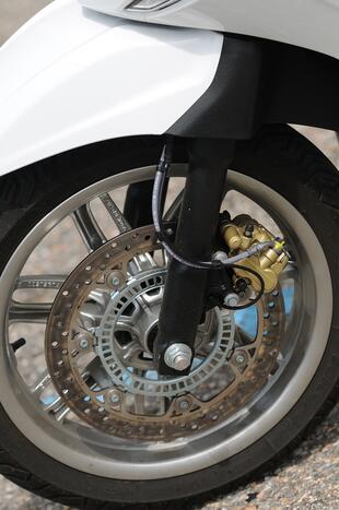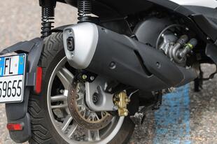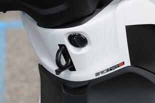 A dimostrazione della sua indole sportiva, il Beverly 310 monta un disco semi-flottante da 300 mm all’anteriore, abbinato a un disco da 240 mm dietro. Rispetto ad altri rivali, la pedana non è piatta: c’è un tunnel basso dove si trova il serbatoio della benzina che limita la capacità di carico. Il vano sottosella è ampio e può contenere senza problemi un casco modulare e avanza spazio per altri oggetti. Per un secondo casco però ci vuole il bauletto. Lo sportello dietro lo scudo nasconde invece un vano profondo ma stretto, dotato di presa USB per la ricarica.