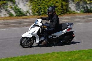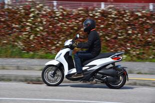 La sella è comoda, le sospensioni a punto e lo spazio non manca. Lo scudo protegge, ma non c’è il parabrezza. Il Beverly consente di mettere i piedi a terra con sicurezza anche a chi è sopra il metro e 70 e il motore molto elastico garantisce un ottimo spunto in partenza. Anche la progressione è lineare fino alla velocità massima, grazie al cambio automatico con variatore perfettamente a punto. Al Beverly finora mancava un po’ di grinta nello scatto al semaforo, ma il nuovo motore 310 è tutta un’altra cosa: ha una velocità di punta di riferimento per la categoria e una grande spinta agli alti regimi, così come in ripresa.