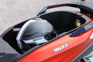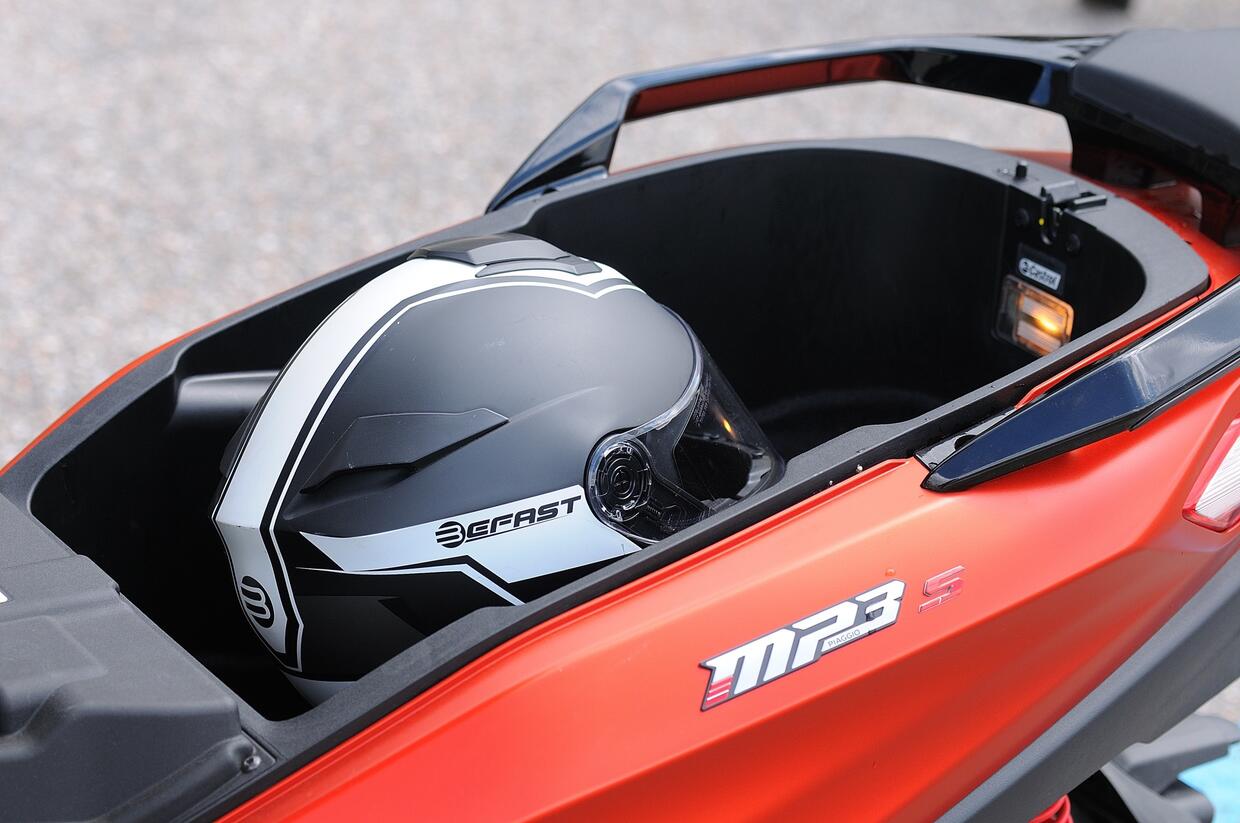 Sollevando la sella si accede a un ampio vano dotato di luce di cortesia e di un morbido rivestimento: ha una forma regolare e può accogliere due caschi integrali. Le finiture sono ottime: l’MP3 è curatissimo in tutti i dettagli, ha componenti di qualità e una dotazione di alto livello.