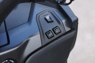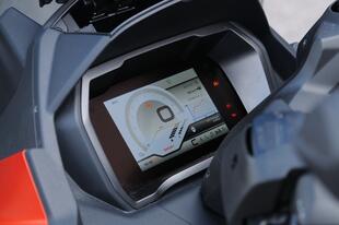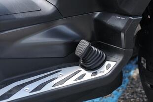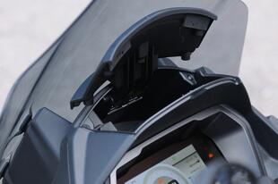 Il parabrezza di serie è ampio e protegge bene busto e testa del pilota. Anche lo scudo è largo e ripara a dovere le gambe. Il display TFT da 7” a colori è un computer di bordo ricco di informazioni da consultare e, grazie all’App Piaggio MIA, si può connettere allo smartphone. Sopra la strumentazione TFT è ricavato un piccolo vano protetto da uno sportellino, in cui è presente anche la presa USB per ricaricare il telefono. Nel retroscudo invece non ci sono vani, ma è presente la leva per inserire il freno di stazionamento, fondamentale nelle soste in discesa. I pulsanti nel retroscudo consentono di aprire la sella e lo sportello per accedere al tappo del serbatoio sul tunnel: per fare rifornimento non serve quindi scendere dallo scooter. Il pedale sulla pedana di destra comanda la frenata dei tre dischi, è comodo da raggiungere con il piede e sempre facilmente dosabile.