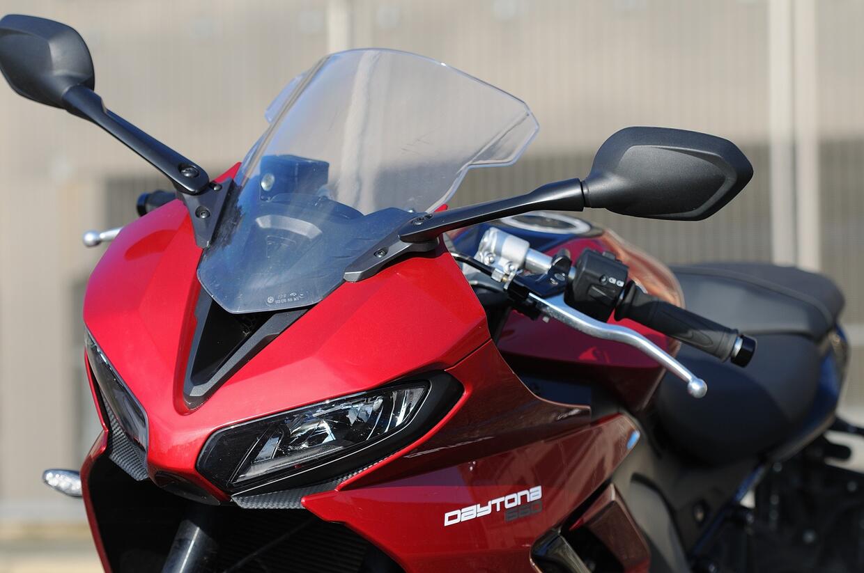 L’aggressivo cupolino della Daytona ripara discretamente il busto del pilota. I doppi fari a LED garantiscono un’ottima visibilità viaggiando di notte. Il cruscotto della Triumph è poco ampio e piuttosto basico: offre tutte le informazioni necessarie, ma i caratteri della schermo LCD sono piccoli e difficili da leggere. Di qualità i comandi al manubrio, ma il blocchetto sinistro è piuttosto “affollato”, con tasti piccoli e poco intuitivi, soprattutto con i guanti. In generale la qualità costruttiva è buona, così come le finiture.
