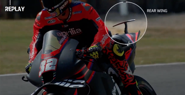 MotoGP La MotoGP insegue la F1: sull'Aprilia debutta l'alettone Al Mugello, sulla RS-GP di Lorenzo Savadori, si è visto per la prima volta un alettoncino che ha il compito di generare carico aerodinamico in fase di frenata. Il downforce generato non è molto, ma anche per per alette inizialmente c'era parecchio scetticismo e ora tutti le usano