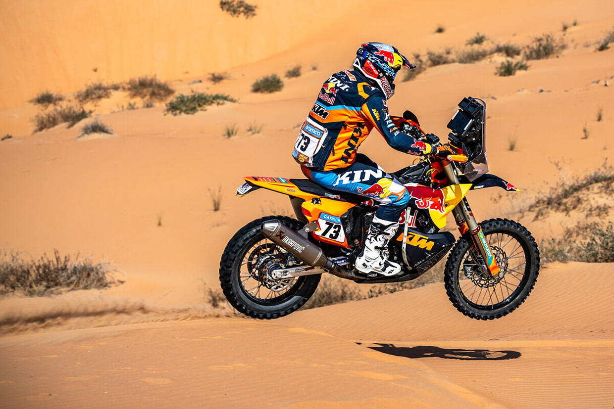 Avendo vinto anche la tappa di ieri, Luciano Benavides parte per primo aprendo la strada agli altri. Daniel Sanders non indugia e seguendo le sue tracce, al primo controllo orario, situato al km 40, fa segnare il primo tempo, seguito a 14” dal compagno di squadra nel team Red Bull KTM, Edgar Canet, e da quattro Honda ufficiali: Ricky Brabec a 25 “, Adrien Van Beveren a 50”, Tosha Schareina a 1’08” e Skyler Howes a 1’11”. Sembra si stia preparando uno scontro da Guerre Stellari, invece arriva Docherty, partito 41’ dopo Benavides, e stacca il miglior tempo precedendo di 1’02” Rui Gonçalves.
