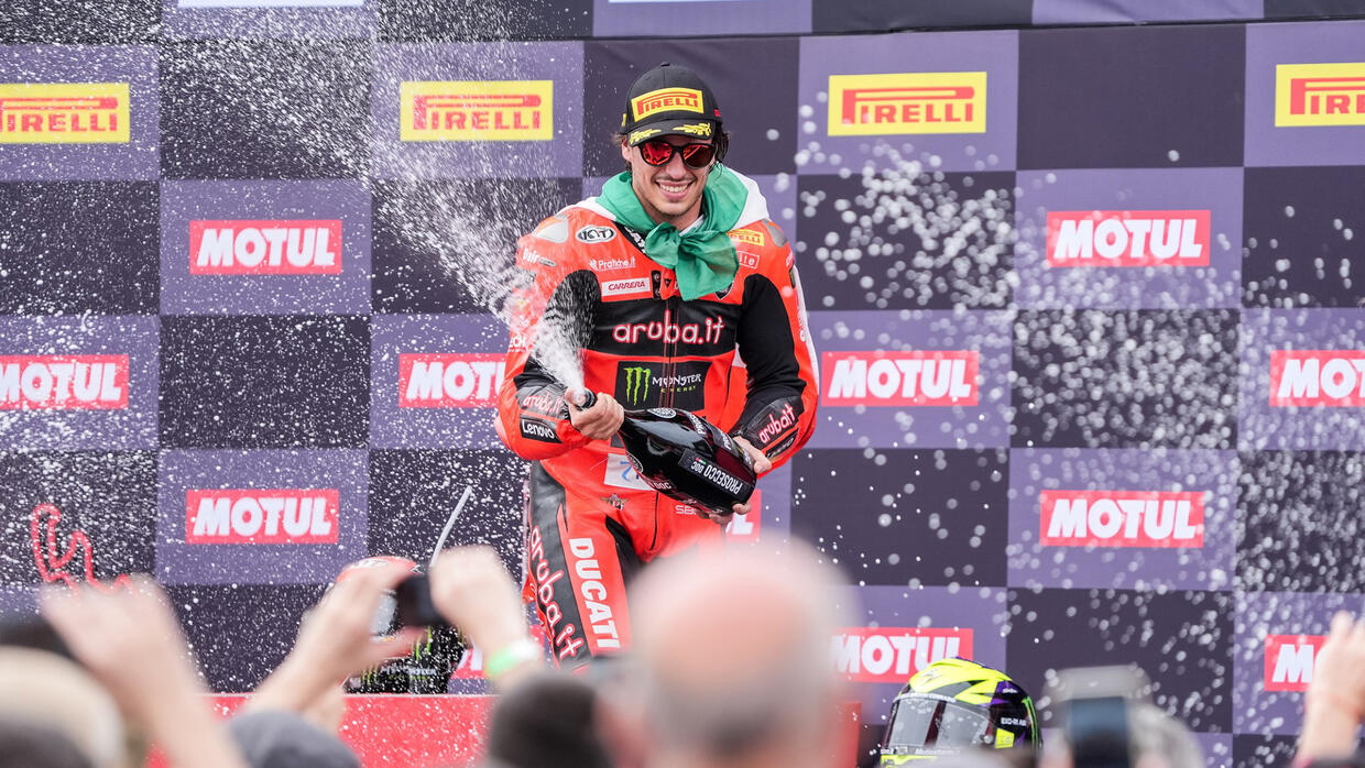 La pista di Aragón è sempre stata favorevole alla Ducati Superbike, che vi aveva vinto già otto volte, ma non era per niente scontato riuscire nuovamente nell’impresa: Toprak Razgatlıoğlu appariva fortissimo e aveva già vinto la gara del sabato. Ma domenica tutto è cambiato: Nicolò Bulega ha tirato fuori le unghie ed ha vinto sia la Superpole Race che Gara 2 battendo il turco di forza. Questa volta ha un sorriso che va da un orecchio all’altro.