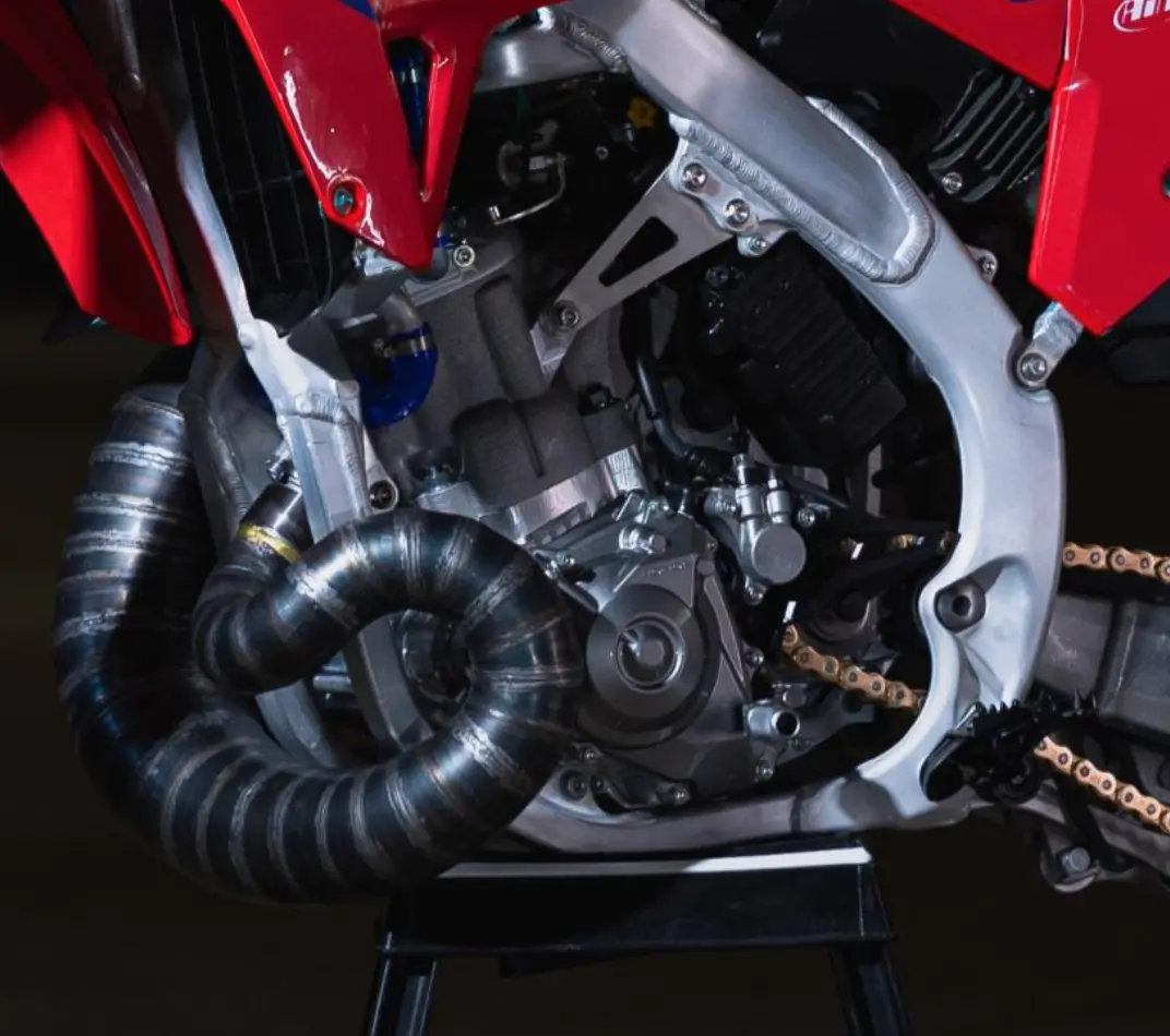 Ma non solo: il motore costruito dall'azienda vicentina è regolarmente in vendita, non si tratta insomma di un esperimento. Tornando alla sua genesi, il guizzo alla base della realizzazione è notevole. Perché il propulsore non è semplicemente un vecchio due tempi, ma un motore di nuova fattura, che sfrutta l'attuale basamento del 450, ma con una termica ridisegnata e ottimizzata. Il motore inoltre ha tutti quegli “accessori” che lo rendono un due tempi moderno e funzionale: avviamento elettrico, frizione idraulica, iniezione elettronica, traction control e un nutrito set di mappature (ben cinque). Il sistema di iniezione standard è stato implementato con una nuova centralina della Tomasin R&D. Un adeguato raffreddamento è garantito da una pompa dell'acqua elettrica.