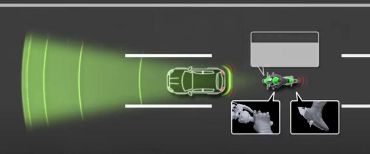 Ecco un bel video esplicativo delle funzioni del sistema di radar Kawasaki. In pratica un sensore radar frontale monitora la distanza e la velocità del veicolo che precede. Quando un veicolo si trova nelle immediate vicinanze e c'è il pericolo di una collisione se viene mantenuta la velocità attuale, il sistema avvisa il pilota utilizzando una luce LED rossa lampeggiante sopra il quadro strumenti